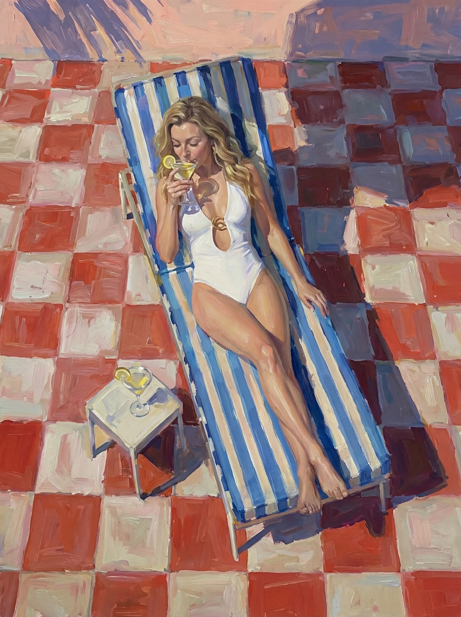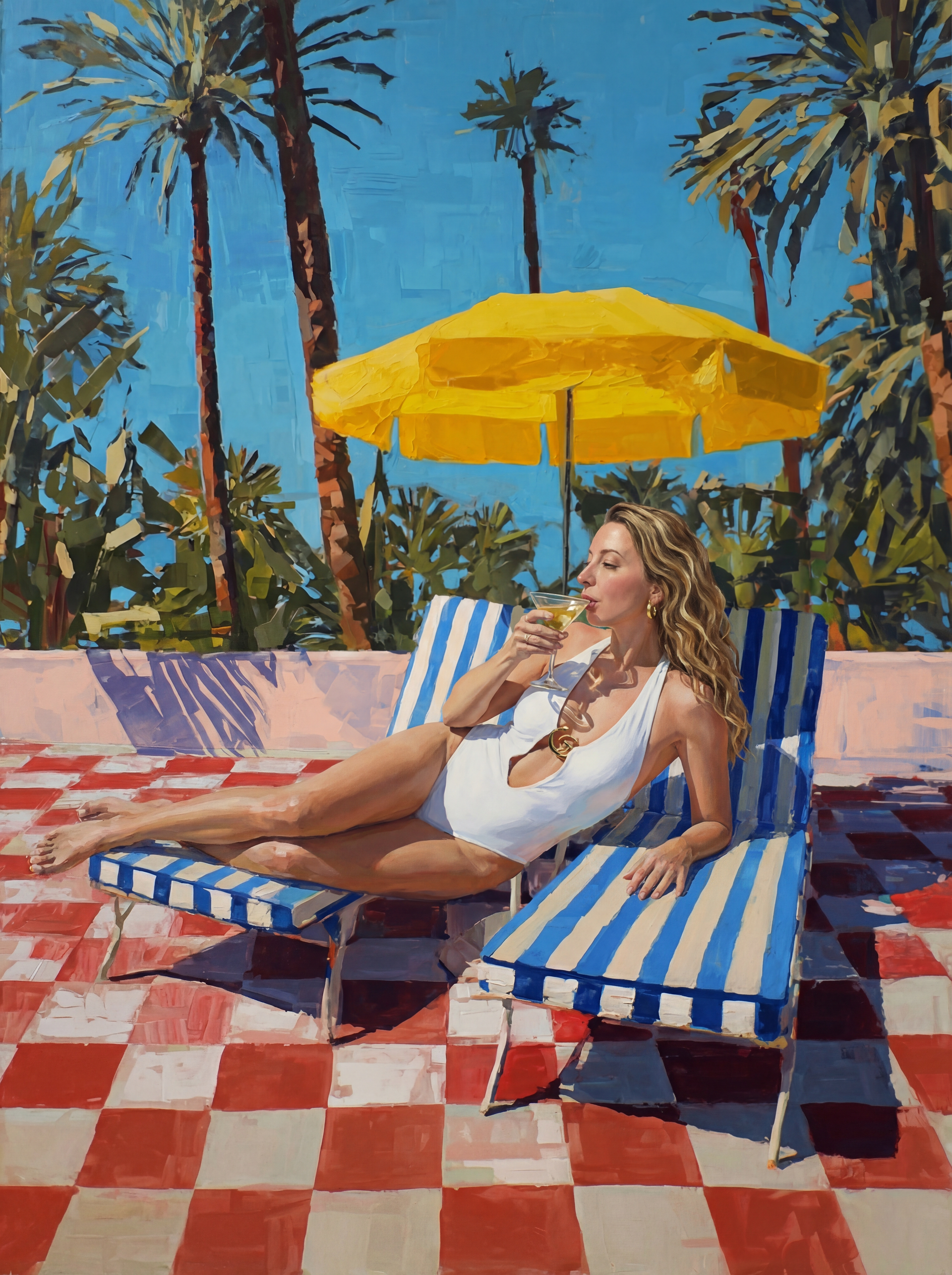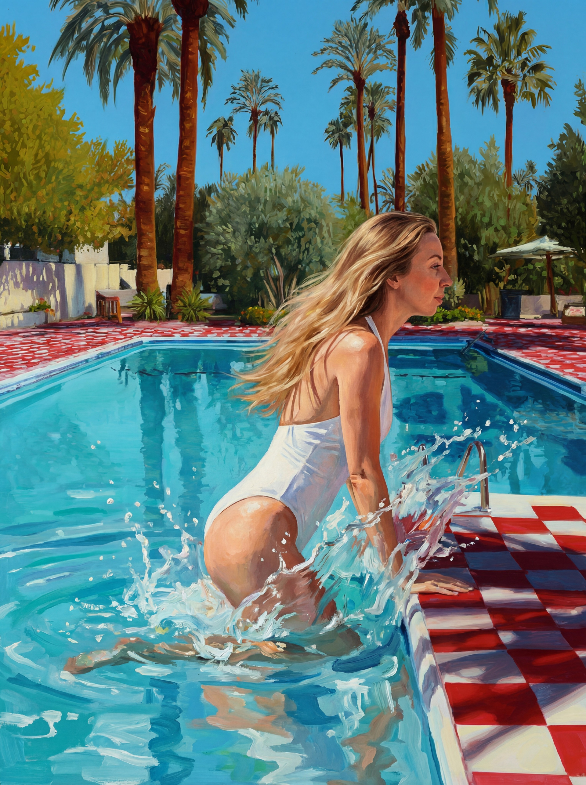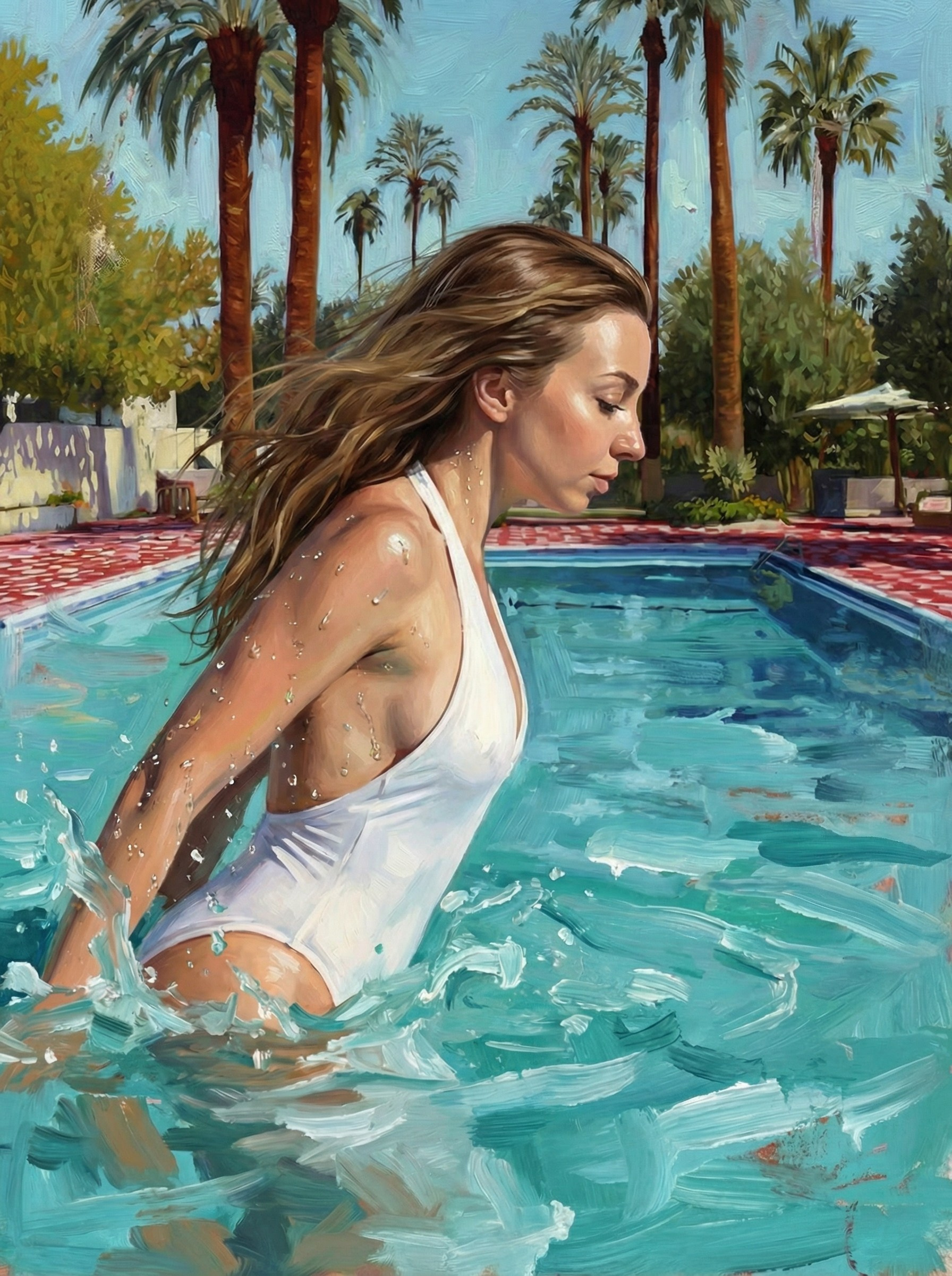 Интеграция реального персонажа в живописную среду. Контраст между физическим телом и художественным пространством создаёт ощущение нереальности и усиливает внимание к образу.